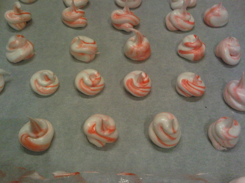 But all is not for naught. I did end up with 3 trays of blobbish pink meringue dots. The early ones (when the piping bag thing was going well) are stripey.
